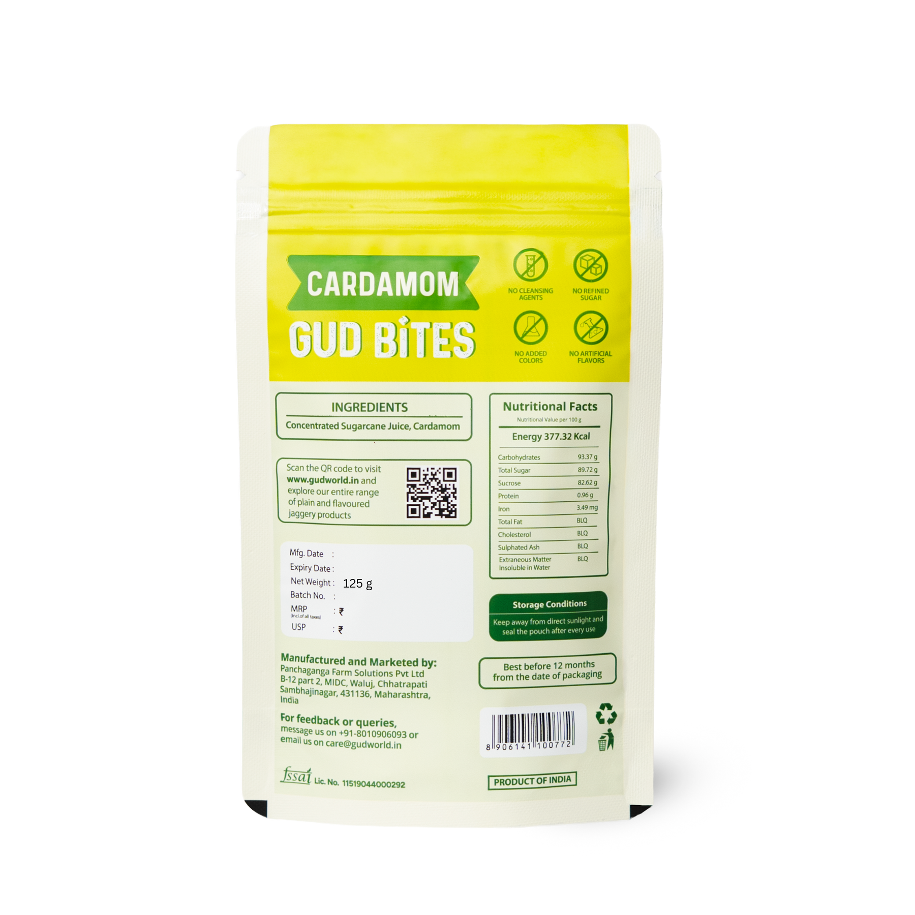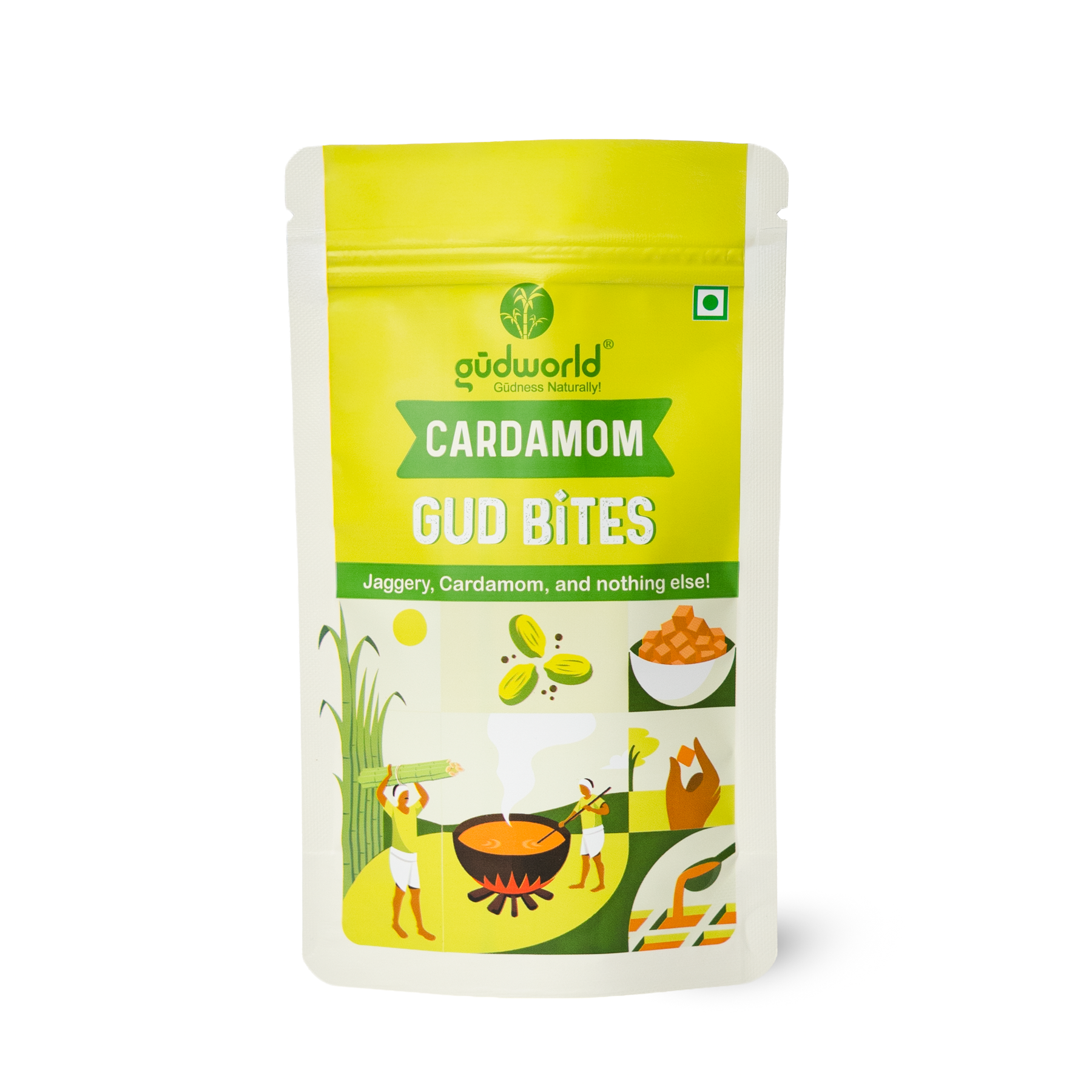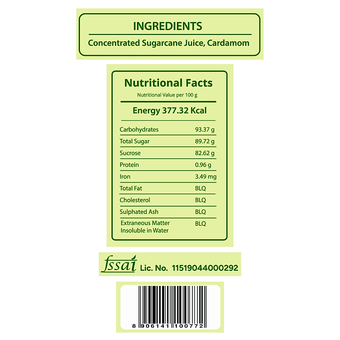 • We make our Cardamom Gud Bites from Organically grown Sugarcane and Cardamom by following a chemical-free process that makes it 100% Natural.