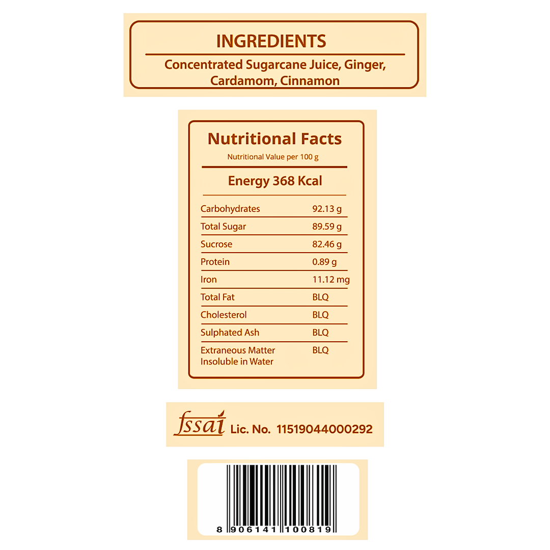 • We aim to retain Jaggery's original authentic taste and are strictly against the practice of adding any synthetic flavor to our Jaggery.
