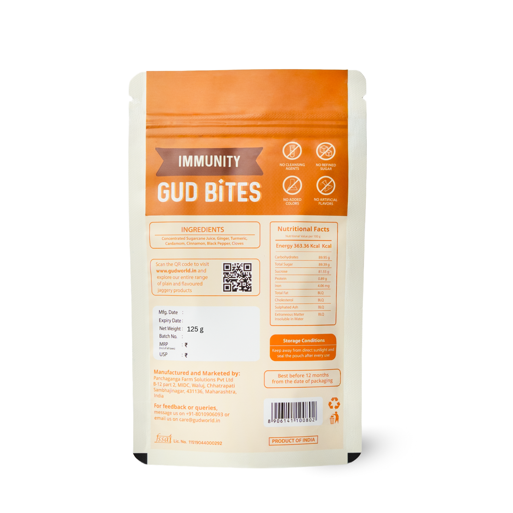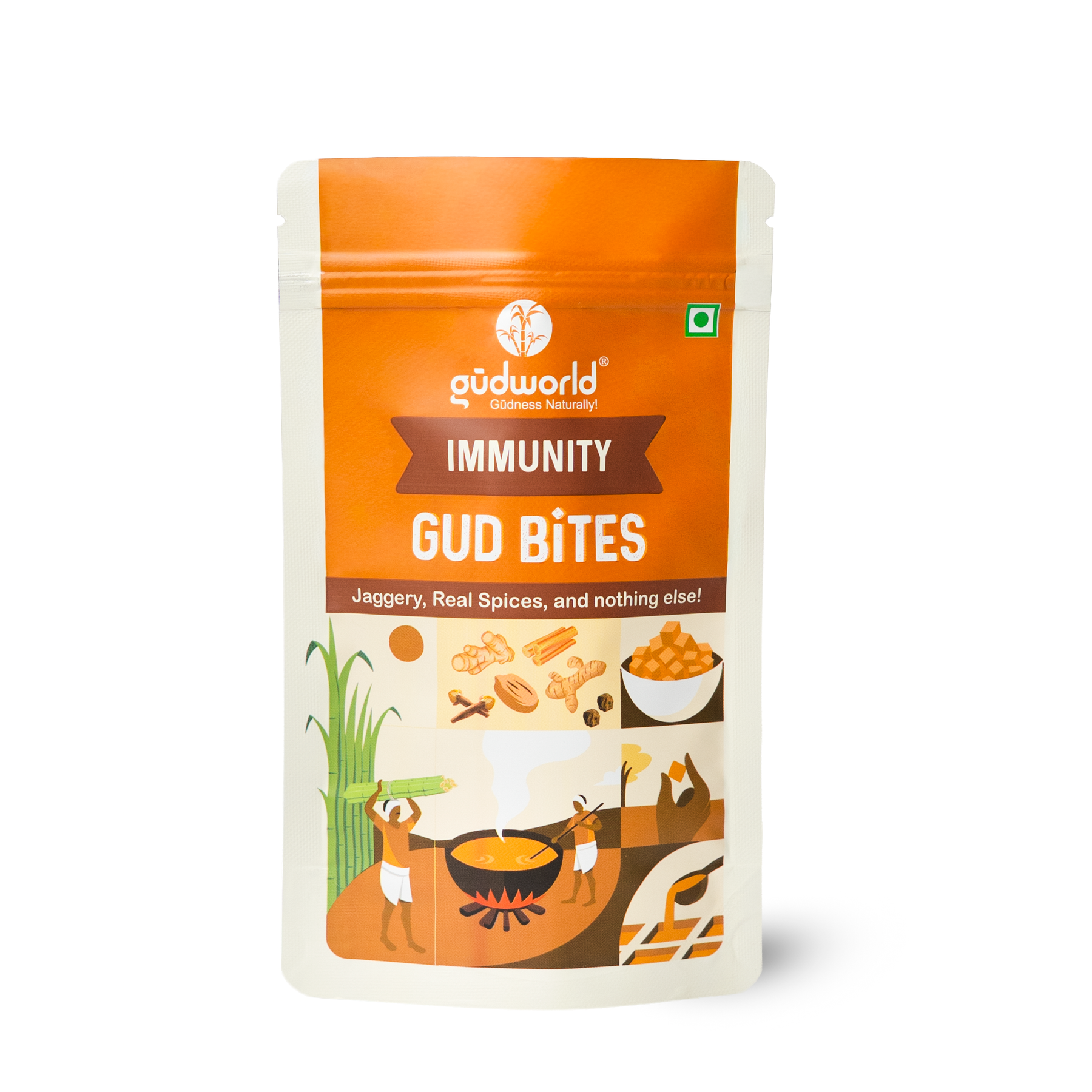 • Gudworld's Immunity Gud Bites are a superfood sweetener in a granulated free-flowing form made from organically grown Sugarcane and Spices by following a chemical-free process that makes it 100% Natural.